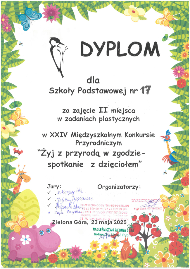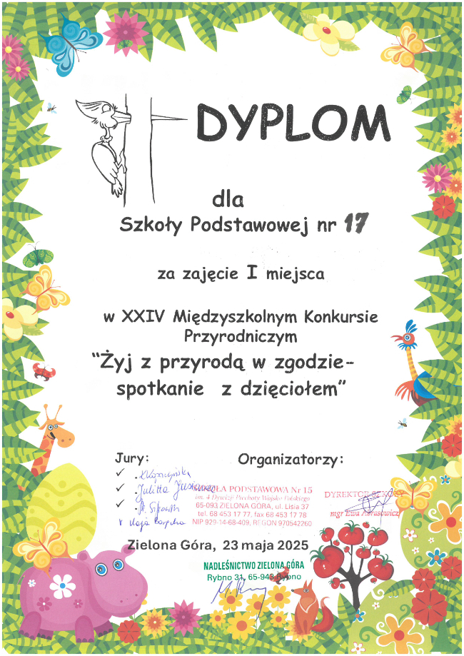 Za nami XXIV Edycja Międzyszkolnego Konkursu Przyrodniczego „Żyj z przyrodą w zgodzie”, organizowanego przez Szkołę Podstawową nr 15 i Nadleśnictwo Zielona Góra. Tematyka konkursu obejmowała zadania o tematyce przyrodniczej dotyczącej lasu oraz jego mieszkańców, w tym roku ze szczególnym uwzględnieniem dzięcioła dużego. W konkursie uczestniczyło 13 szkół z naszego miasta. Z wiedzy o lesie uczniowie reprezentujący naszą szkołę Amelia, Matylda i Franek z klasy 4B zajęli I miejsce z wynikiem 49,5 punktu, natomiast z zadania plastycznego uzyskali II miejsce. Dziękujemy uczniom klasy 4B za udział w konkursie i gratulujemy wspaniałego sukcesu.