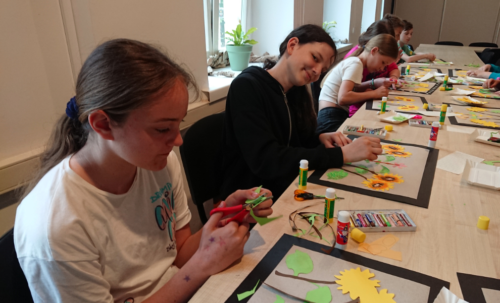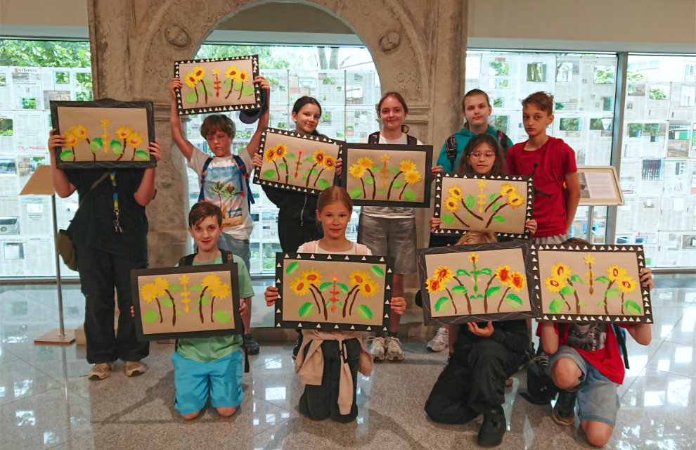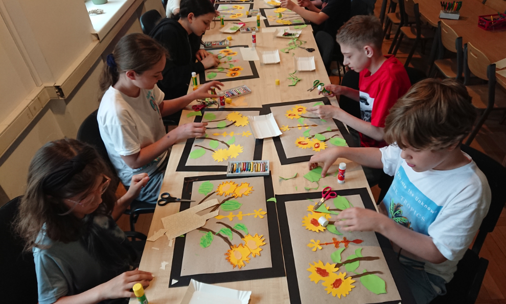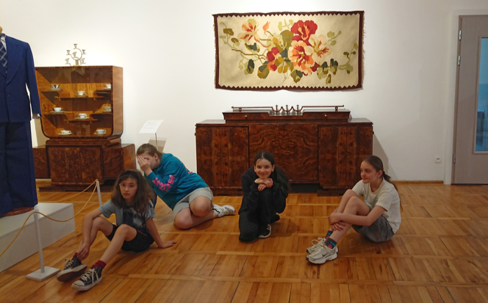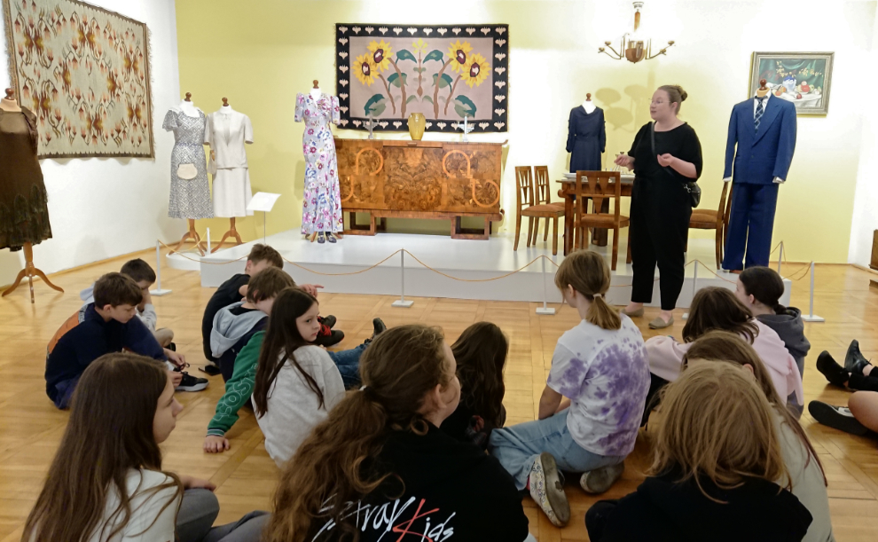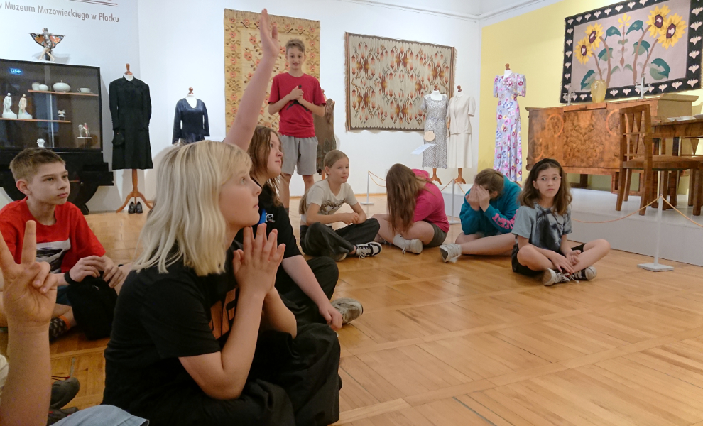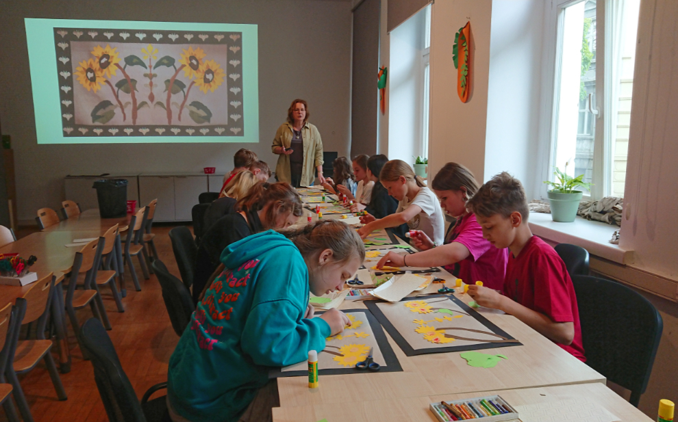 Po wysłuchaniu opowieści przewodniczki o ekspozycji, udaliśmy się na warsztaty plastyczne. Uczniowie tworzyli papierowe kilimy na wzór jednego z pokazywanego na wystawie. Kilim to ręcznie tkana, dwustronna tkanina o orientalnym rodowodzie, która zdobiła wówczas ściany mieszkań.