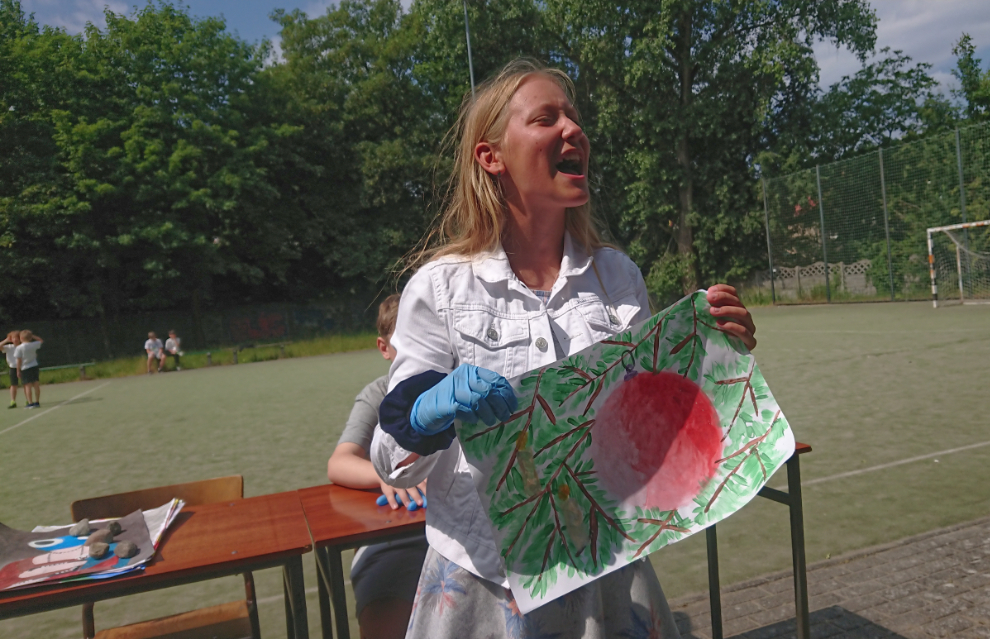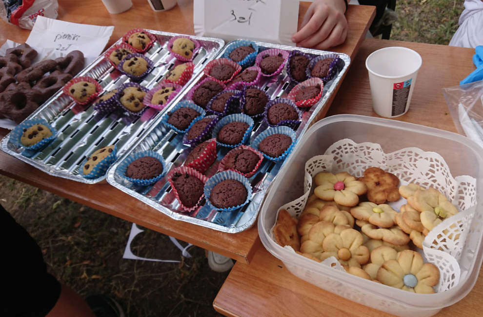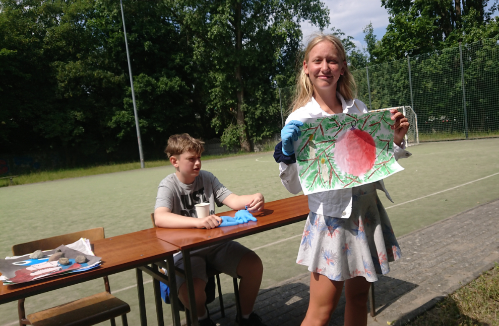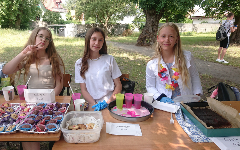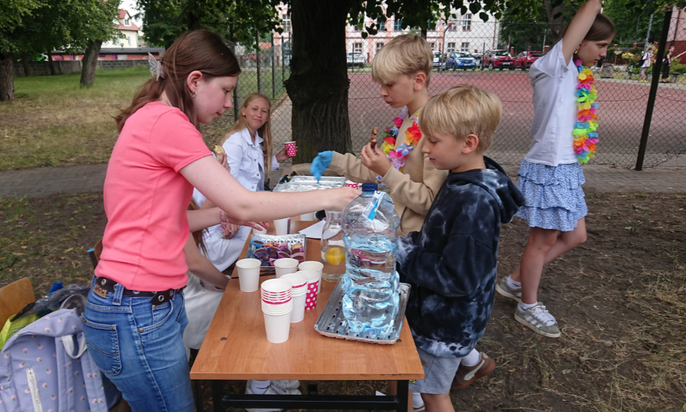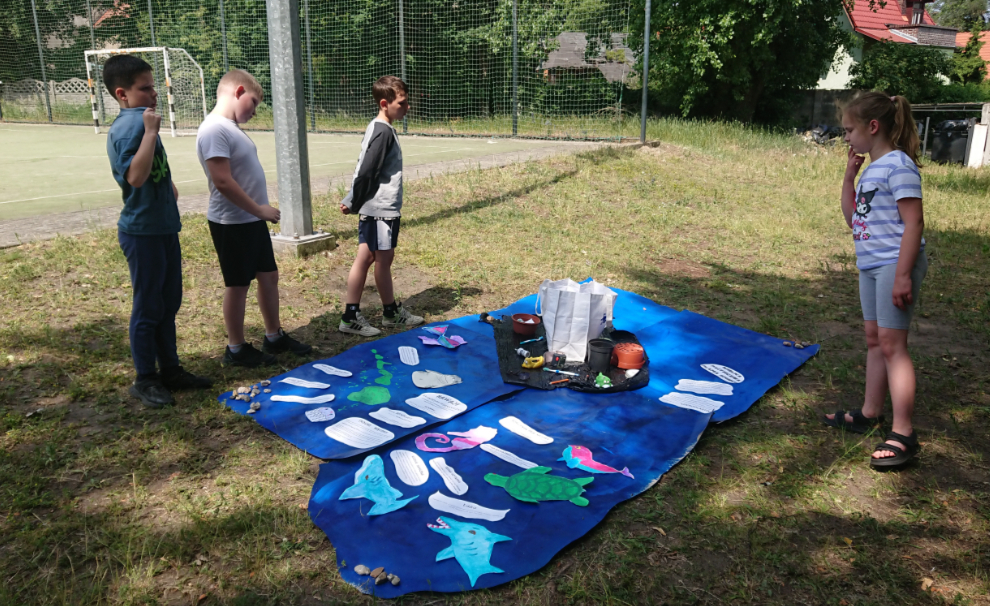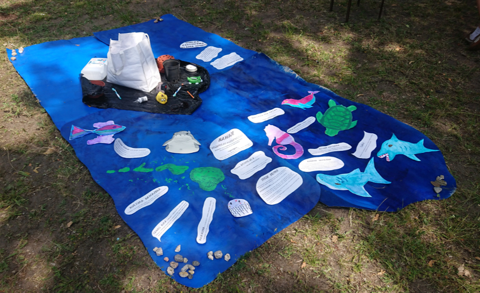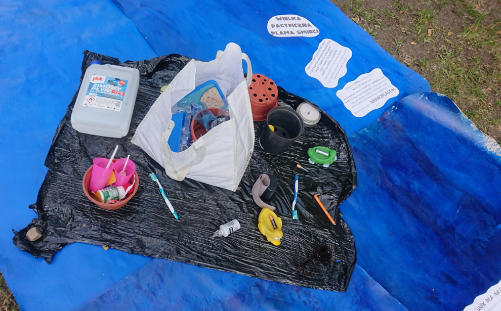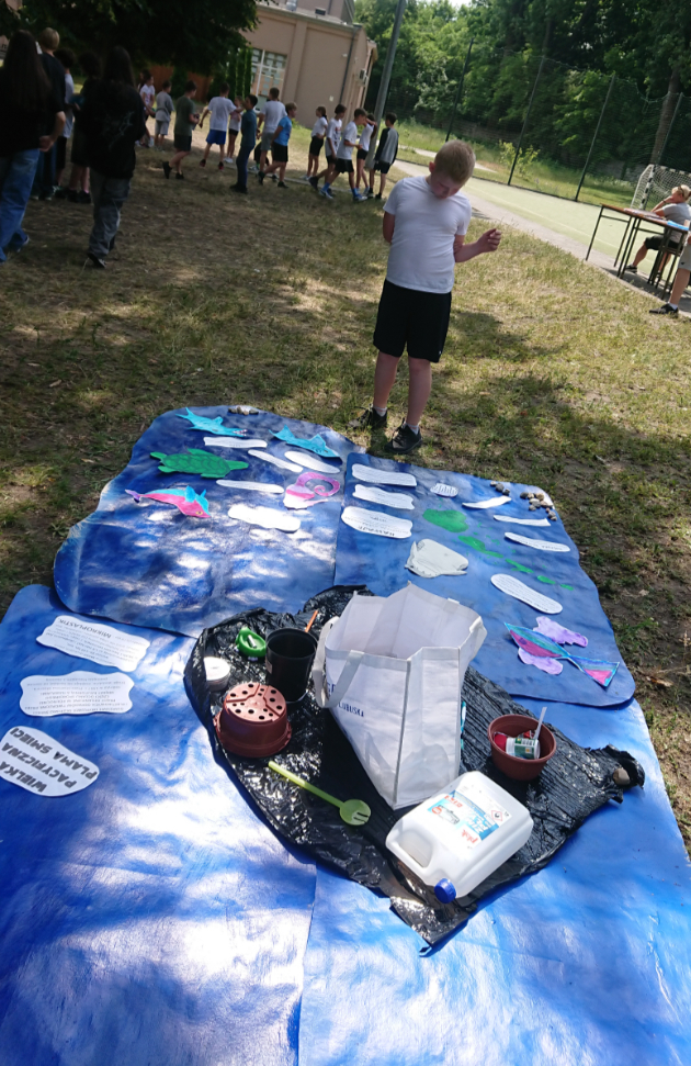 Podczas happeningu stworzyliśmy makietę Oceanu Spokojnego wraz ze śmieciową wyspą, rafą koralową wokół Hawajów, Piotr i Tymur przeprowadził aukcję dzieł sztuki stworzonych przez uczniów klasy 7c (Iza, Kaja, Tymur), a młodsi uczniowie mogli wziąć udział w warsztatach tworzenia hawajskich naszyjników z recyklingu. Wykorzystaliśmy do tego denka plastikowych butelek. Tańczyliśmy hawajski taniec hula (prowadzące: Kaja, Ania) i smakowaliśmy owocowe pyszności i babeczki na kiermaszu, przygotowanym przez Izę, Lilę, Maję i Asię.