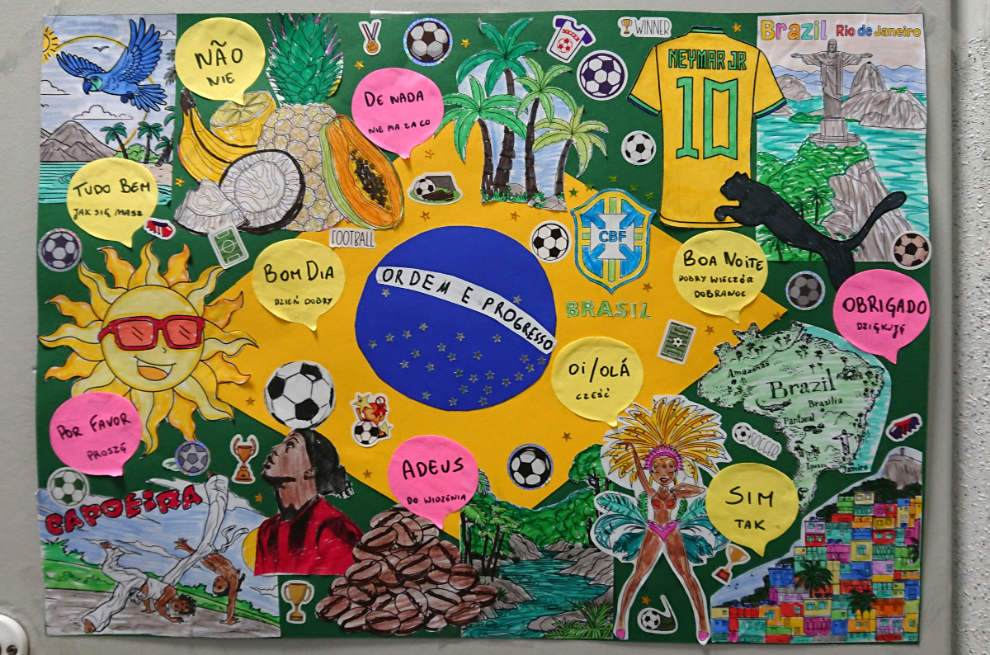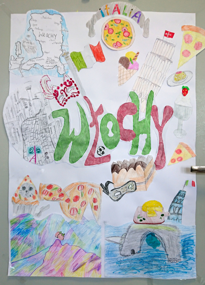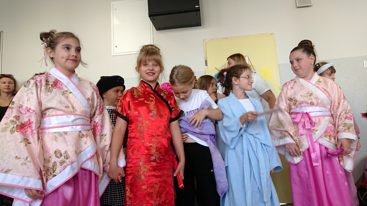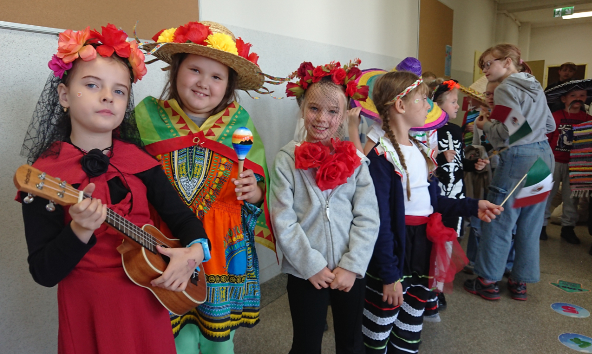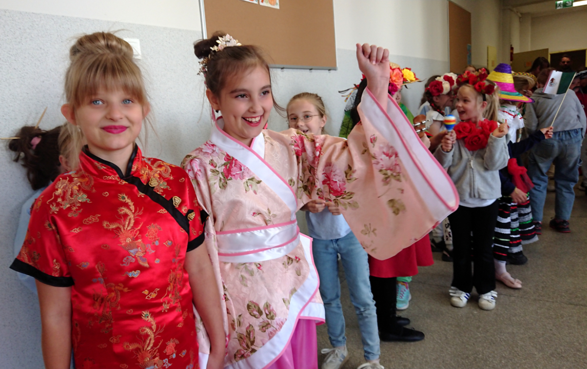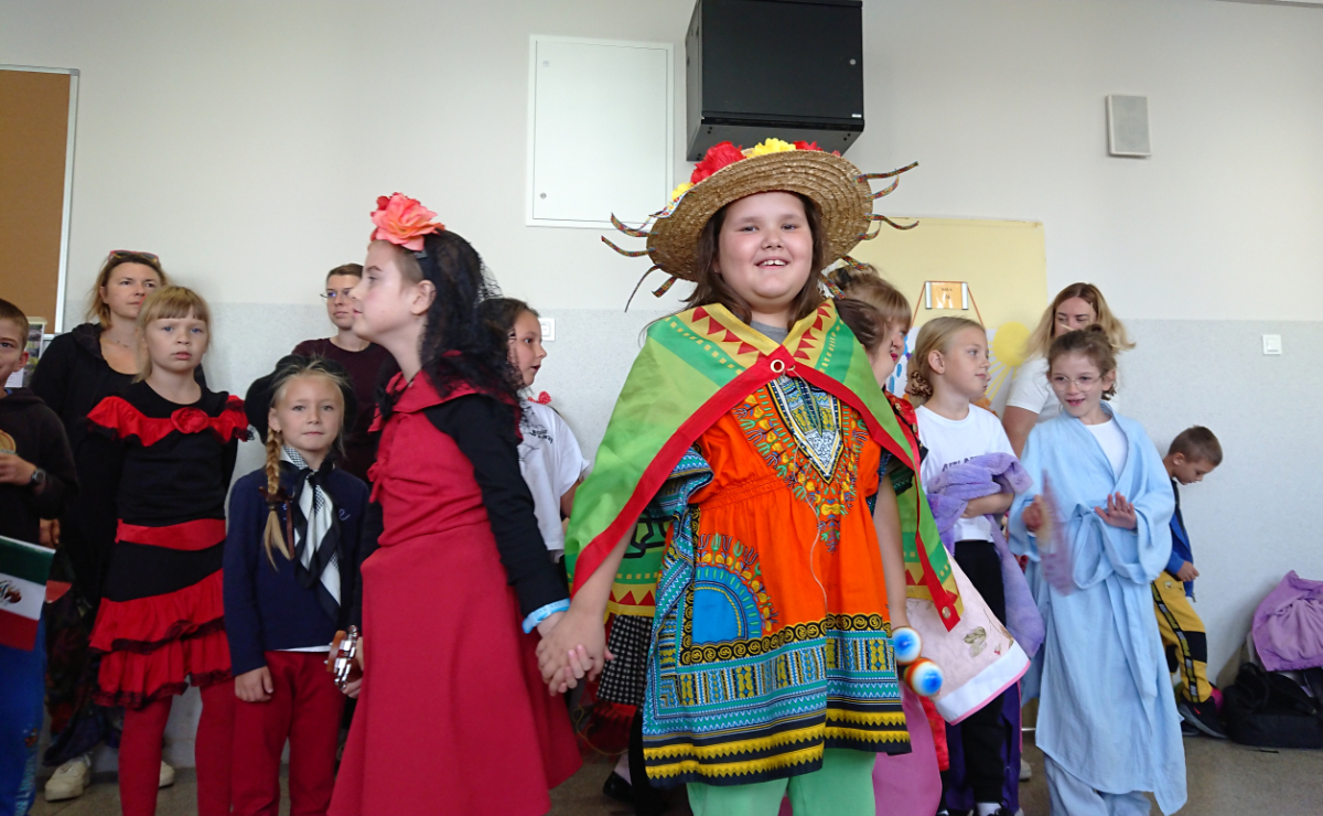Tegoroczne święto z okazji Dnia Języków Obcych było pełne kolorów, radości i pozytywnej energii! Każda klasa wylosowała kraj, który następnie prezentowała poprzez stroje, plakaty i ciekawostki. Dzięki temu mogliśmy odbyć małą podróż dookoła świata, nie ruszając się ze szkoły. Stroje przygotowali najmłodsi – uczniowie klas 1-3 z pomocą i wielkim zaangażowaniem rodziców. Dużo formatowe plakaty – kolaże były efektem pracy zespołowej klas 4-7. Każda klasa wspólnie stworzyła jedno dzieło, łączące pojedynczo wykonane przez każdego w klasie rysunki i ilustracje na temat danego kraju. Były tez plakaty indywidualne, zawierające różne ciekawostki ze świata. Możecie je obecnie oglądać na szkolnych korytarzach. Wszystkie przykuwają uwagę na dłużej!