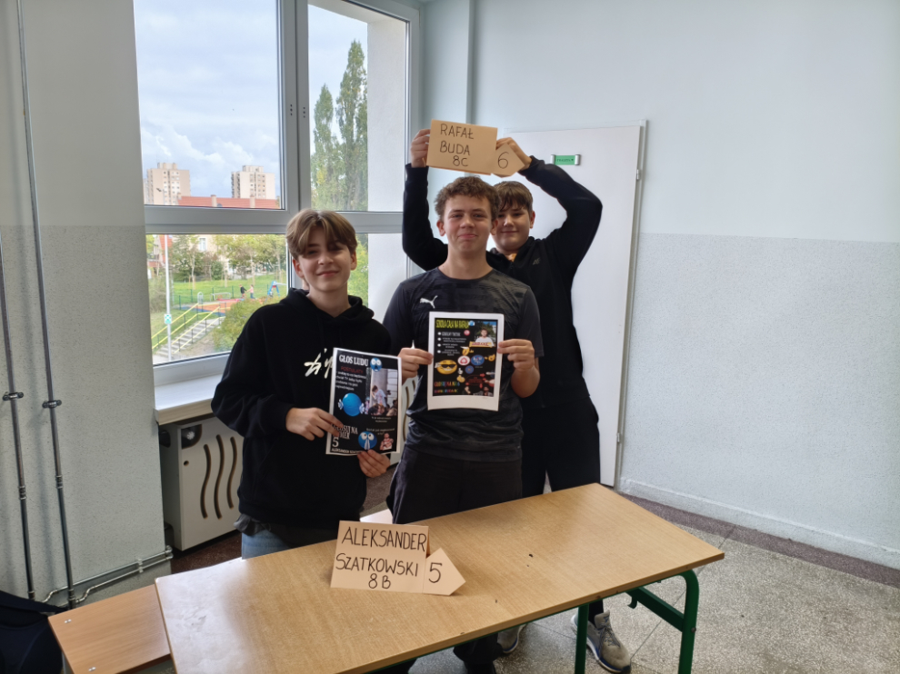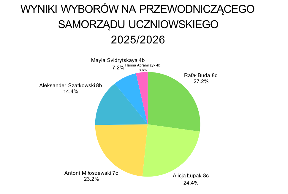 Po podliczeniu wszystkich głosów ogłoszono skład Rady Samorządu Uczniowskiego na rok szkolny 2025/2026 Przewodniczącym został Rafał Buda z klasy 8c. Zastępcy: Alicja Łupak z klasy 8c oraz Antoni Miłoszewski z klasy 7c.
