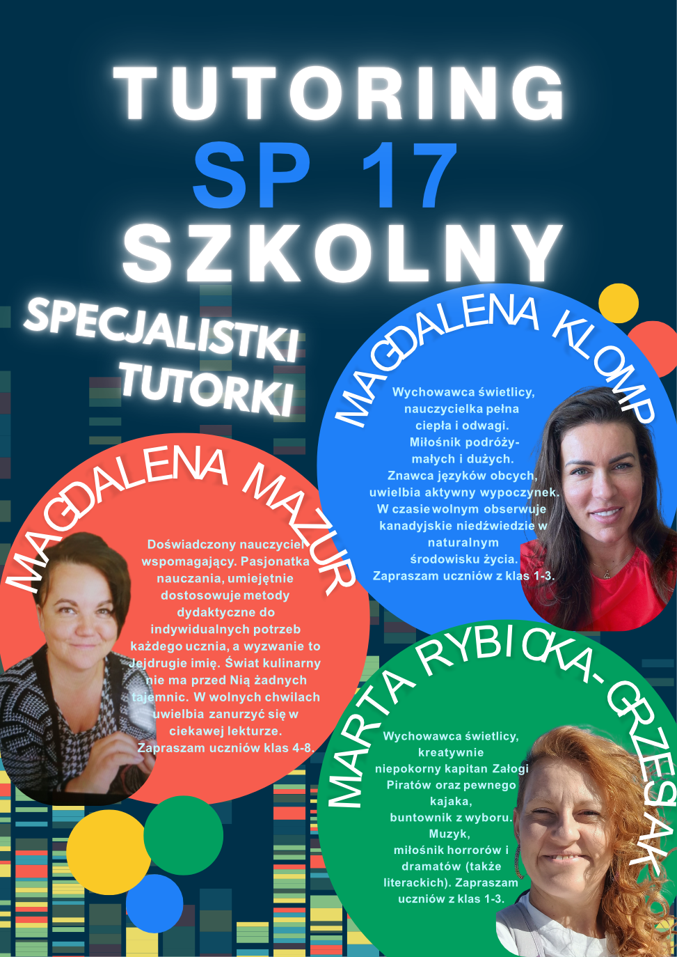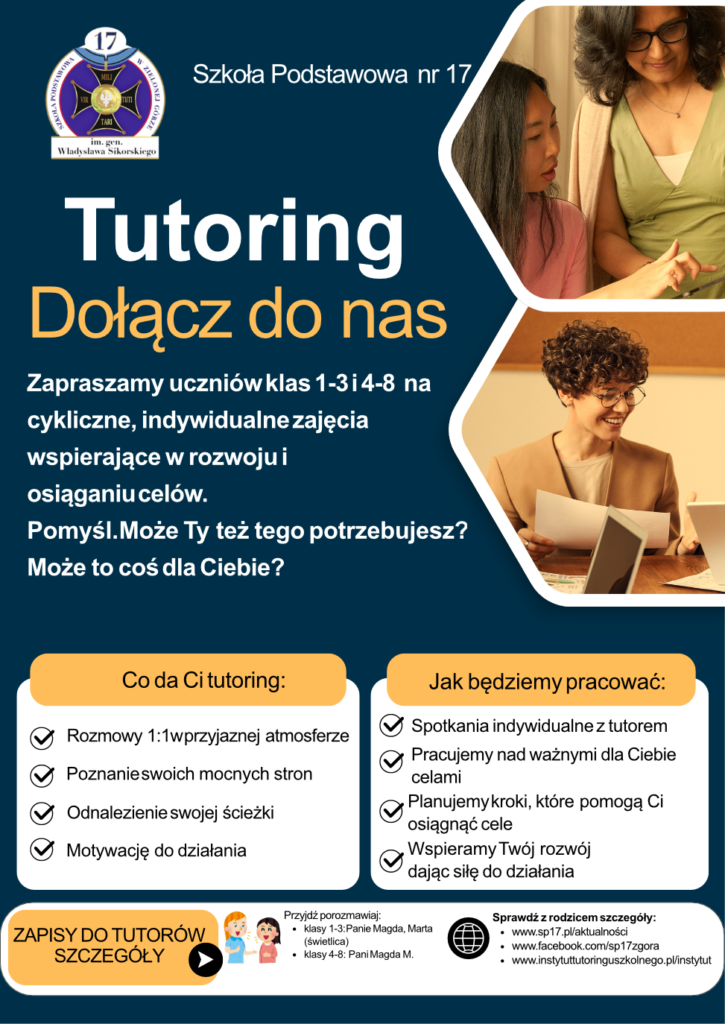 Jeszcze w tym tygodniu w Szkole Podstawowej nr 17 startują zapisy na indywidualne, cykliczne zajęcia rozwijające potencjał i możliwości młodych ludzi, czyli Wasze, Drodzy Uczniowie. Poprowadzą je tutorki – pani Magda, Marta dla klasa 1-3 oraz Magda dla klas 4-8.