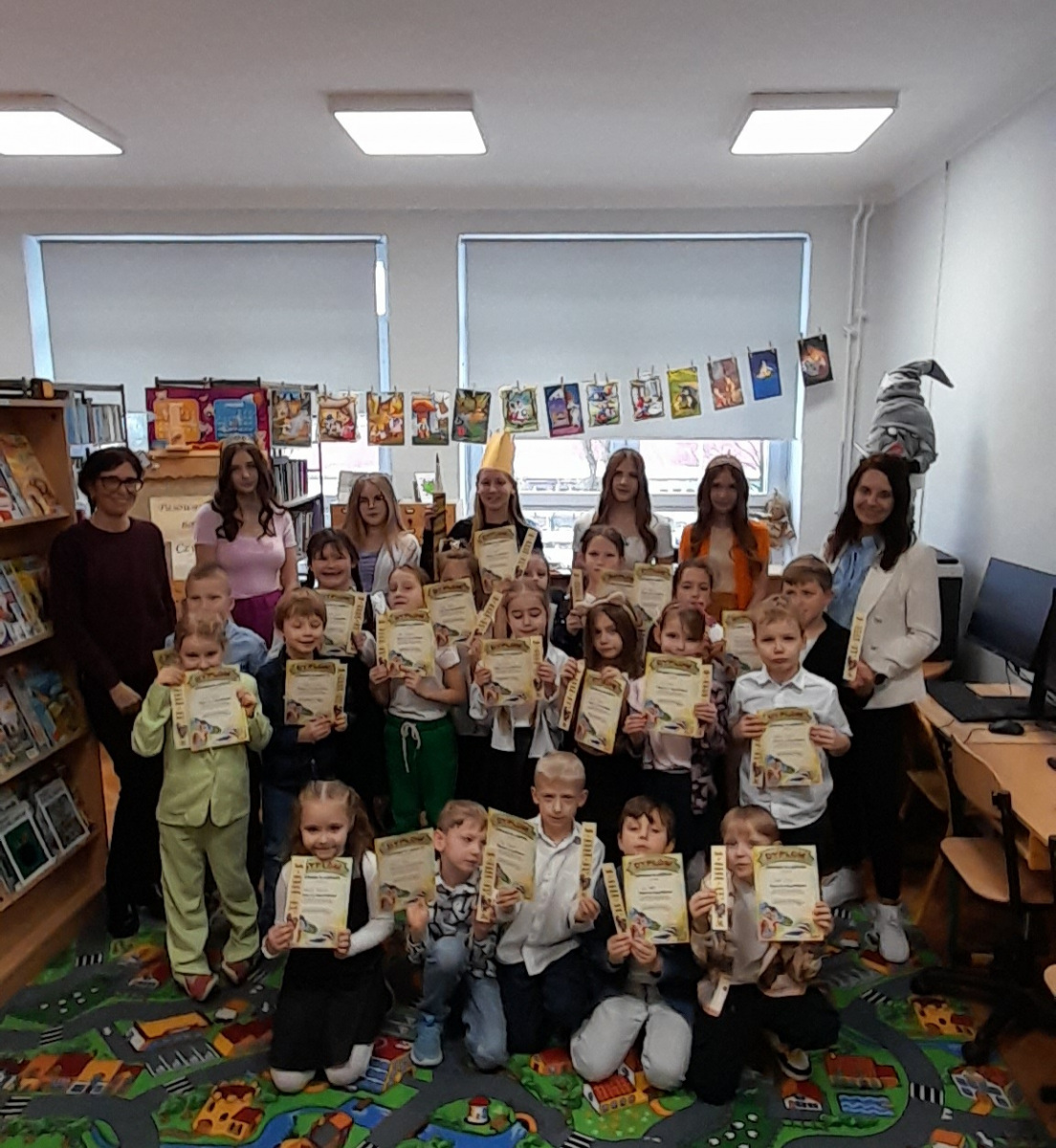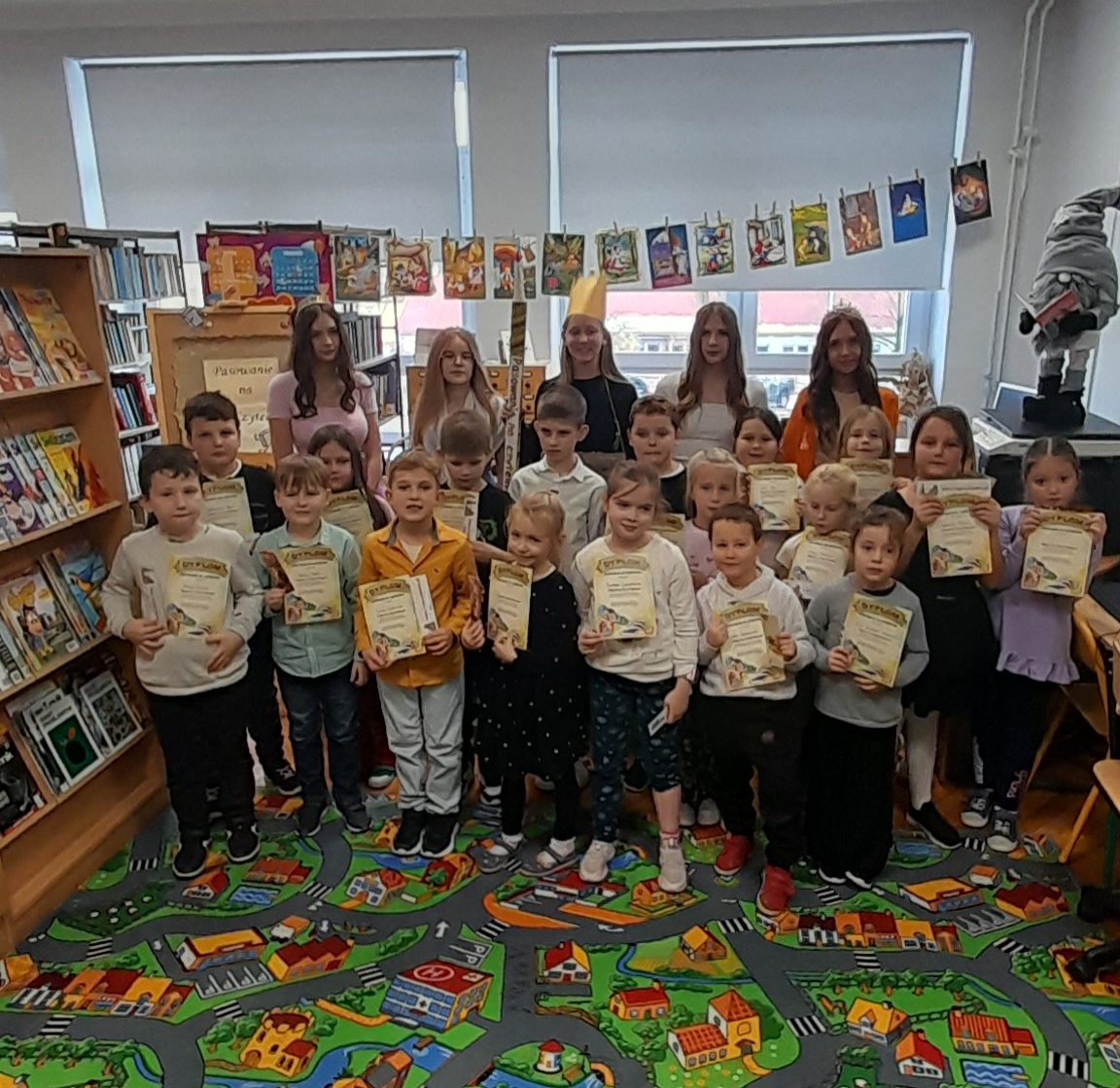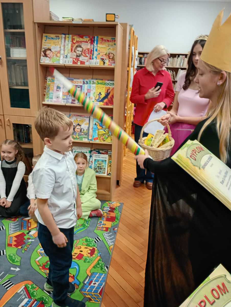 Ale żeby zostać prawdziwymi czytelnikami, musiały zdać jeszcze jeden sprawdzian, przejść przez trzy próby: Wiedzy, Wyobraźni i Szacunku. Uczniowie spisali się znakomicie, obiecali dbać o książki, szanować je i często odwiedzać bibliotekę. Po złożeniu przysięgi nastąpił najważniejszy moment, akt pasowania na czytelnika. Nowi czytelnicy otrzymali pamiątkowe dyplomy oraz kolorowe zakładki do książek. Uroczystość przebiegła w radosnej, magicznej atmosferze, a pierwszoklasiści z entuzjazmem opuścili bibliotekę, deklarując, że będą częstymi gośćmi w świecie książek.