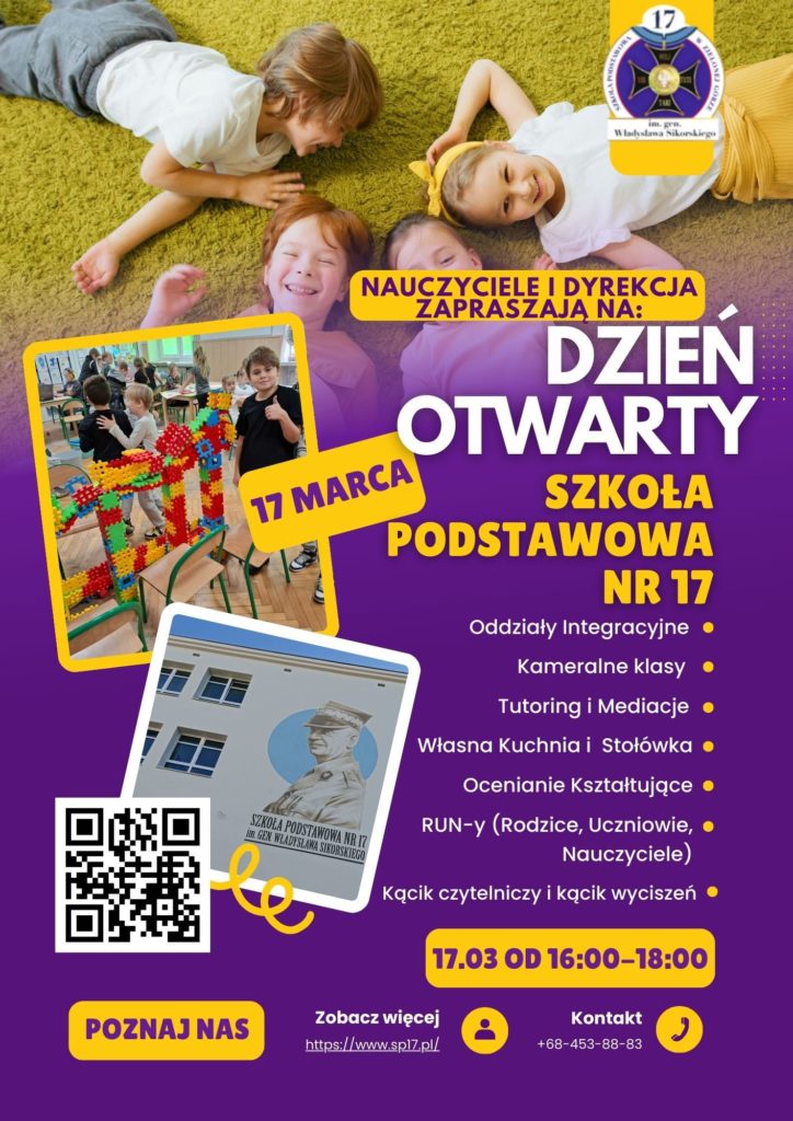 DZIEŃ OTWARTY SZKOŁY 28 lutego 2026 Zapraszamy rodziców i przyszłych pierwszaków do naszej szkoły na Dzień Otwarty SP17! Szykujemy dla Was wiele atrakcji, w których będą mogły wziąć udział Wasze pociechy. Zapiszcie w kalendarzu: 17 marca 2026 r., w godzinach 16-18 🙂